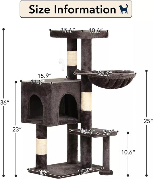 36-Inch Gray Cat Tree Tower with Scratching Posts and Hammock for Indoor Cats