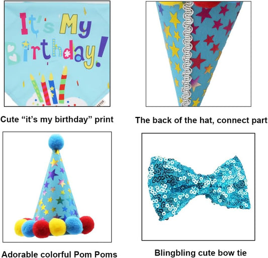 Dog Birthday Bandana and Party Hat Set with Bow Tie for Medium to Large Dogs (Large, Blue)